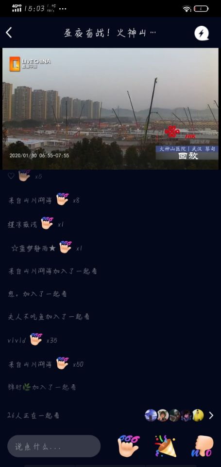 18级6班团支部,全体团员于2020年2月12日下午15时学习内容——线上观看:存奋战!雷神山、火神山医院建设过程。活动结束后,同学们纷纷表示,在这场无声的战”疫”中,我们要贡献自的力量,参与到此次的活动中,了解责任与便命,彰显大学生担当,以爱之名,共同战“疫”,坚决打赢这场疫情防控阻击战。