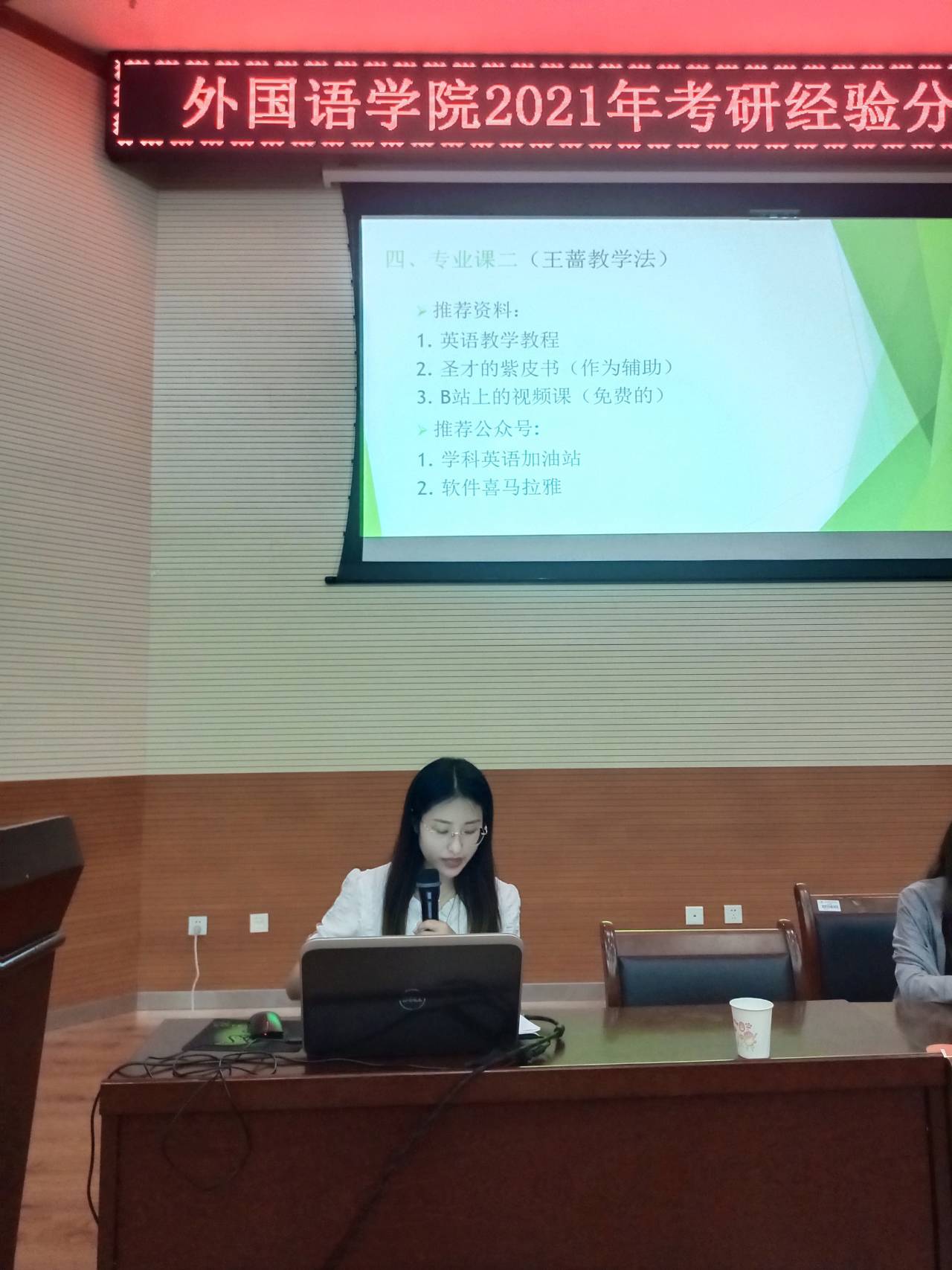 王亚俐和魏学蓉同学,分别分享了她们在备考西北师范大学学科英语专业方面的经验。她们建议大家灵活地调整自己的报考院校,不要扎堆报考同一所学校;要掌握自己的复习节奏,不要和别人对比产生不必要的焦虑;要注意备考过程中的心态调整,定期和亲人朋友倾泻自己的烦恼,不要让自己有过重的心理负担。