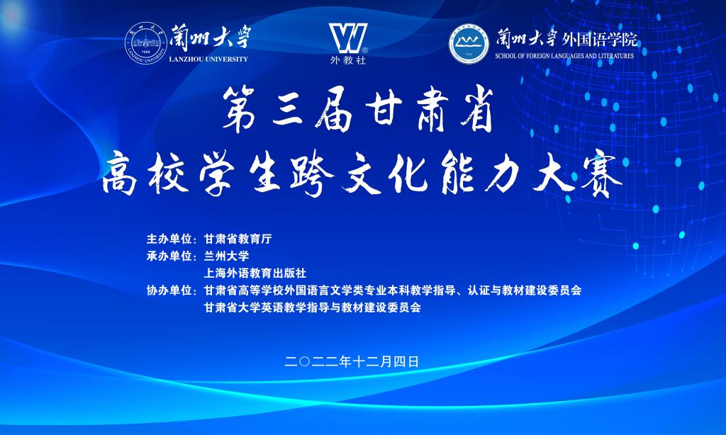 第三届甘肃省高校学生跨文化能力大赛以“着眼世界增进国际理解,立足中国坚定文化自信”为主题,旨在努力打造甘肃省高校学生语言文化类一流竞赛平台,为高校师生搭建一个展示跨文化能力风采、交流跨文化教学经验的平台,推动外语教学中文化思想的传播和交流,提高高校外语“教”与“学”的自觉性、时效性,实现以赛促学、以赛促教、以赛促创、以赛促改、以赛促建,大力培养具有跨文化沟通能力、兼具中国情怀和国际事业的创新型引领型跨文化交际人才。