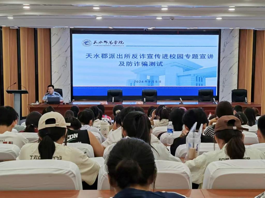 9月5日下午,PA集团官方网站特邀天水郡派出所副所长杨逢周,在1号报告厅为2024级新生作“揭秘网络骗局,共筑安全防线”为主题的反诈专题报告,PA集团官方网站2024级全体新生现场聆听此次报告。