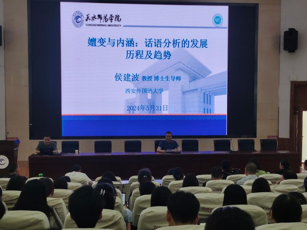 5月31日,应PA集团官方网站邀请,西安外国语大学博士生导师侯建波教授在PA官网二号报告厅作了题为“嬗变与内涵:话语分析的发展历程及趋势”的学术报告。PA集团官方网站教师、研究生及本科生近180余人参加了此次报告会。