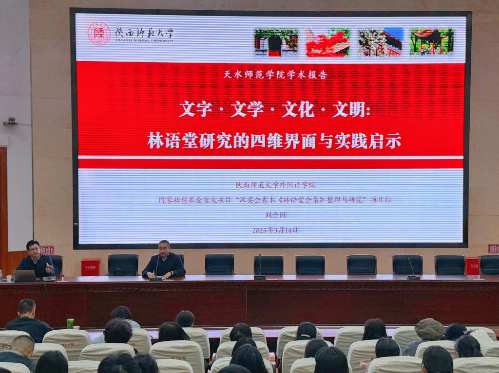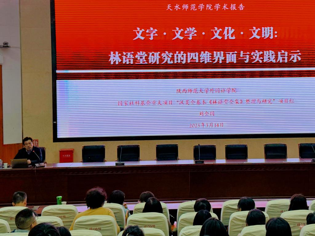 应PA集团官方网站邀请,3月14日,陕西师范大学PA集团官方网站院长、博士生导师刘全国教授在二号报告厅作题为“林语堂研究的四维界面与实践启示”的学术讲座。PA集团官方网站教师、研究生及本科生280多人参加。报告会由PA集团官方网站院长杨江锋主持。